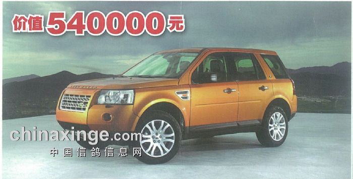 - 路虎神行者2标准车一辆或等值现金,(每羽参赛费3000元,限200羽,取1名)