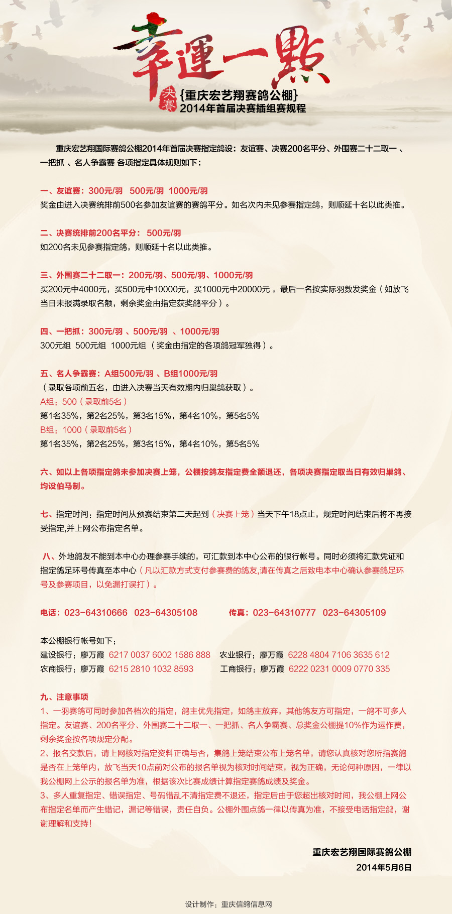 2014年重庆宏艺翔国际公棚决赛指定鸽规程