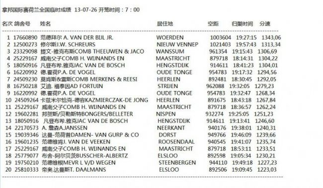成鸽组荷兰冠军由来自Woerden的鸽友van der Bijl A. Jr.获得。其冠军鸽在19:27:15归巢,飞行1003.6公里,平均分速1343.06米/分。