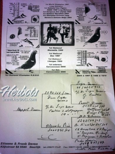在赢尽速度赛上的各种奖项后,尼古拉斯决定专攻国家赛。当然为了加强速度鸽的实力,他从倚天.迪沃斯(Etienne Devos,Deerlijk)和马克.佛希尔德(Marc Verschelde,Zulte)那里买来了鸽蛋。从这些鸽友那里,尼古拉斯不仅获得了鸽蛋,而且还听取了大量好的建议。几年之后,尼古拉斯又从盖伊.巴尔茨(Guy Baerts,养的是托内的鸽子)–艾瑞克.林伯格(Erik Limbourg,Brussegem)–迪诺-贺伯特(Deno-Herbots,Leefdaal)–卡丢斯.乔治(Carteus Georges,Ronse) 和巴滕伯格-凡德米卫(Batenburg-VD Merwe,Klaaswaal)引进了鸽子。现在盖伊.巴尔茨的鸽子已经占了尼古拉斯鸽子的一半。