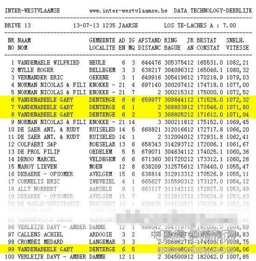 伯特·凡登伯格凭借100%盖比血系战鸽取得2013波尔多长距离比利时国家赛成鸽组5799羽冠军