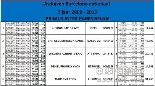 2009-2013年巴塞罗那国际鸽王成绩前5名