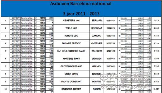 2011-2013年巴塞罗那国际鸽王成绩前10名