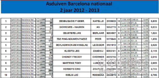 2012-2013年巴塞罗那国际鸽王成绩前10名