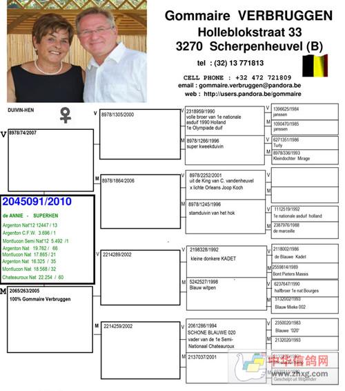 祖母 8978/1864/2006 252/01“国王”鸽系, C 范登胡佛 x 245/96荷兰鸽王全国1位的女儿