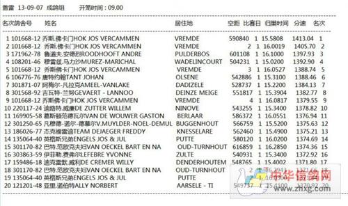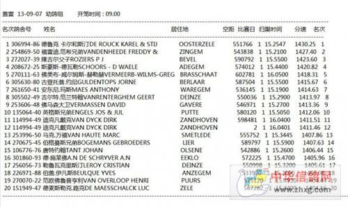 米/分。在幼鸽组前20名成绩中,福雷迪.范希兄弟鸽舍获得亚军,英格斯兄弟鸽舍获得第10名,迪克.凡戴克获得第11、12名的好