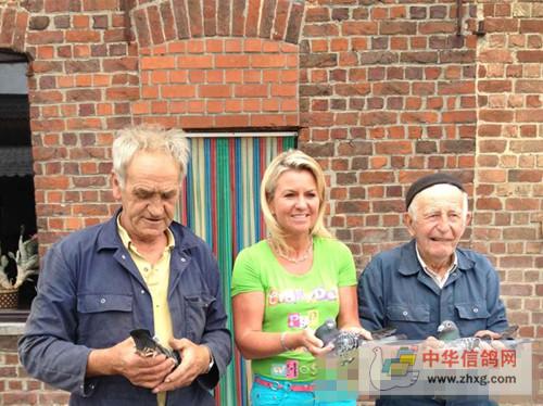 图片说明:艾妮米·范内和范德米尔(Vandewiele)父子,艾妮米手中是2013年巴塞罗那国际赛25294羽6名。右为父亲凡拉尔Valère,
