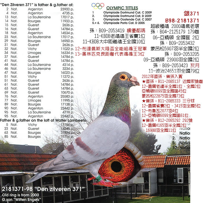 在杰夫鸽舍,我们要特别提及的是“银雄371号”(Zilveren 371,2182371/98)。“银雄371号”所佩戴的脚环是旧脚环,他其实是2000年出生的。“银雄371号”系“白英格”的直孙,他已经作育了许多杰出的幼鸽,彰显了他的杰出育种品质。他的子代以及孙代获得了:亚精顿国家赛22,492羽中冠军、亚精顿国家赛23,900羽中亚军、盖雷(Gueret)3,415羽中亚军、亚精顿4,735羽中4位、拉索特年17,017羽中13位、波治11,933羽中14位、盖雷2,636羽中15位、亚精顿3,501羽中17位、盖雷17,784羽中16位、亚精顿14,534羽中18位、拉索特年16,665羽中20位….这仅仅只是其中跻身前20强的成绩。他的直系后代已经获得过35次前100强的好成绩。
