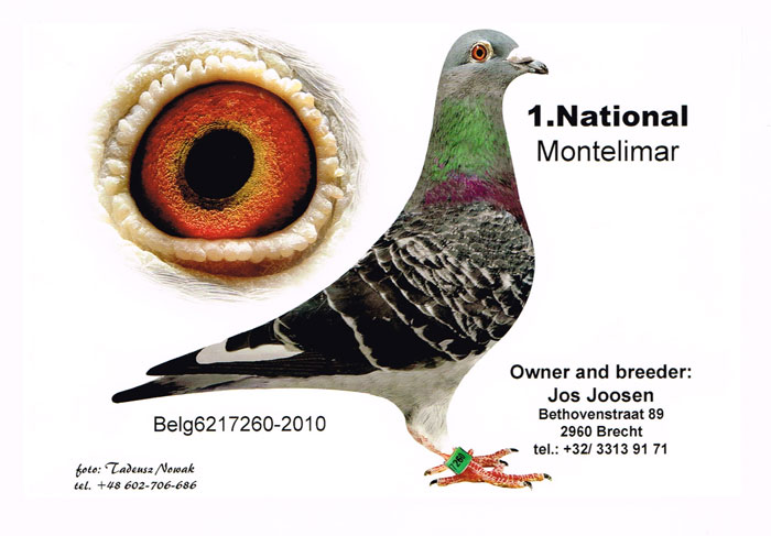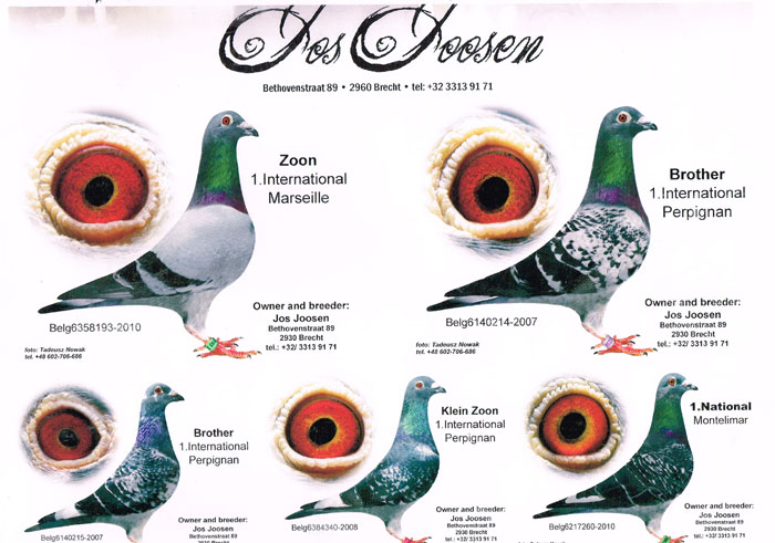今年68岁的乔士.乔森从1976年开始自己的赛鸽事业,起源相当有趣,其父亲早年丧偶,孝顺的乔士.乔森便买了几只鸽子来安慰父亲孤单的心灵,万万没想到几个月后父亲再婚跟阿姨搬去荷兰住,乔森只好把鸽子继续留下来自己养。乔森的鸽子早期主要血源有修斯肯.冯莱尔系、列兹美特.马太依斯系、杰克.万德维根系等,经由和其他强豪交流,共同育种及参赛淘汰、去芜存菁进而成功创造出自己的鸽族,演化成现今适合中长距离竞翔的优秀鸽族,在竞争激烈的安特卫普省,他所获得的省赛冠军及鸽王头衔不胜枚举,比起长距离成绩毫不逊色。乔森在退休前身兼两份工作,同时在法院以及汽车厂服务,退休后全心投入最热爱的赛鸽领域,乔士的超级战绩人尽皆知,许多强豪抢破头想上门求好鸽,或把家里最好的种鸽送来合作配对要求引进直子女,像是卡尔.慕利门、克利斯、贺伯瑞(合作育种作出”艾克Ike “B08-4351119入赏2010 KBDB长距离全国鸽王冠军)等等,另外还有盖比、速霸龙、等顶尖世界级鸽舍,都曾登门要求引进幼鸽或合作育种。