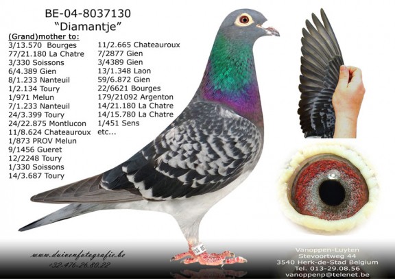 第3个品系是“钻石雌”8037130/2004,曾获亚精顿国家赛4522羽8名。由“花头艾米耶”351/99凡吉尔伯根兄弟 x “贝佛里I号”216/03,贝伦-范欧鹏作育。