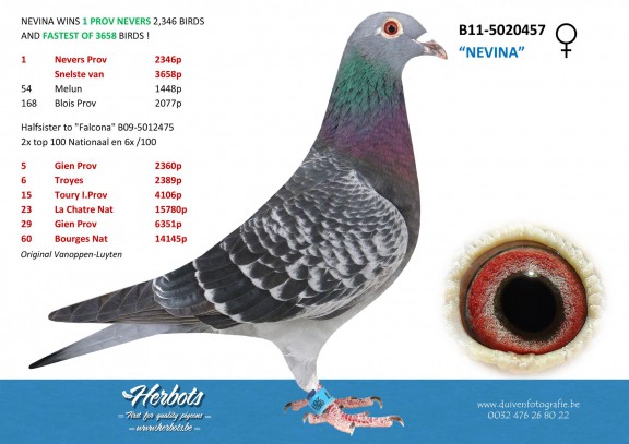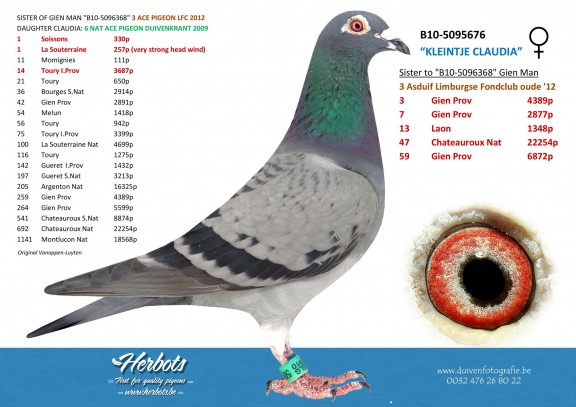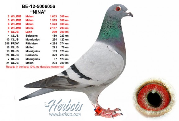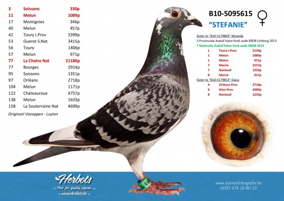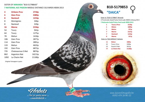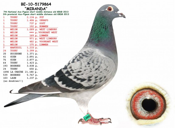 2013年,他们的雌鸽在中距离和中长距离赛上势头强劲。而他们的目标就是要争得几个第一名的名次,甚至是在国家赛上,这点他们做到了:亚精顿国家赛一岁鸽组6801羽1名和伊索顿国家赛老鸽组5670羽1名。除此之外,他们还获得了奥尔良省赛一岁鸽组3516羽1名,11428羽速度最快,波治国家赛一岁鸽组13570羽3名。这是一支名副其实的高水平顶尖鸽队。他们每星期都和比利时最出色的鸽舍们一较高下。这些赛鸽力克群雄,在100-600公里的比赛中大放异彩,成绩出众。